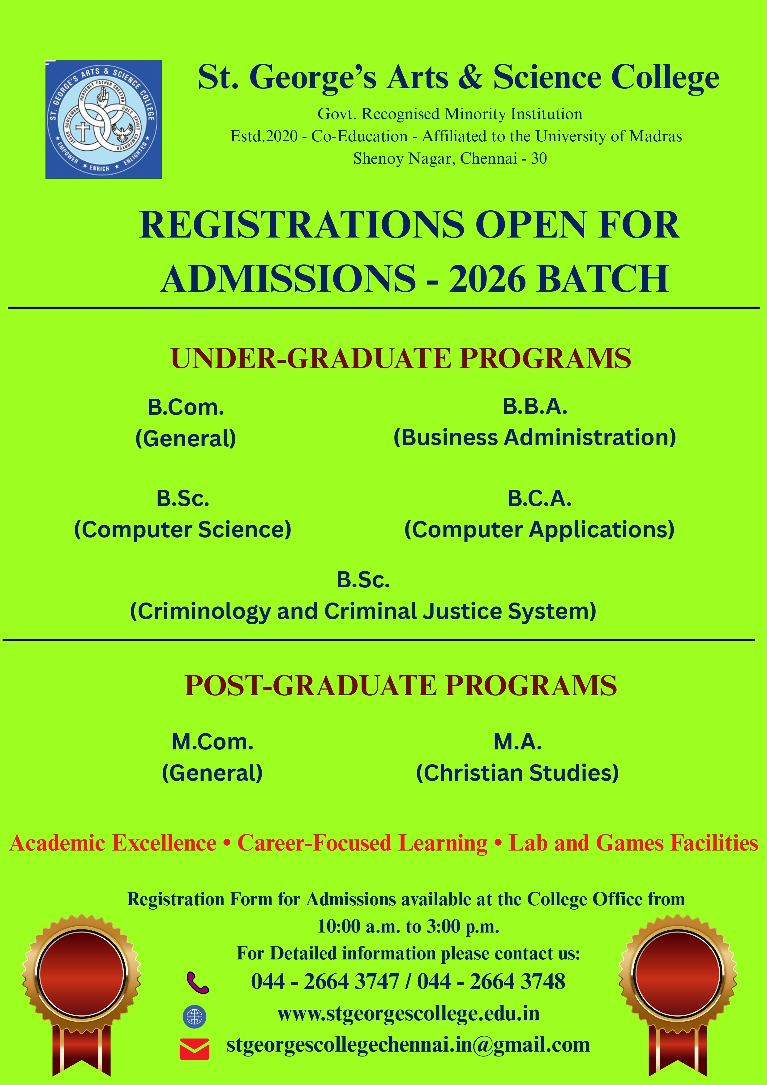 St.George's Arts & Science College welcomes prospective candidates to embark on their educational journey with us. Our admission process for the undergraduate programme is designed to ensure fairness, transparency, and adherence to established guidelines.George's Arts & Science College welcomes prospective candidates to embark on their educational journey with us. Our admission process for the undergraduate programme is designed to ensure fairness, transparency, and adherence